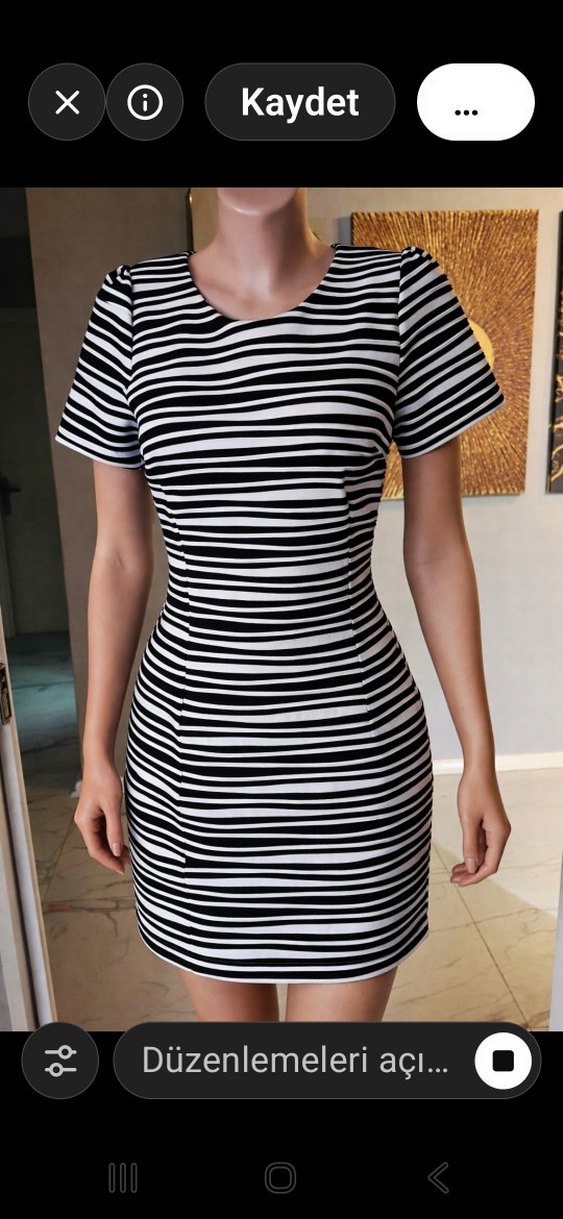 Zebra desenli, kısa kollu ve balıkçı yaka, vücuda oturan elbise. Pile detaylı ve sentetik kumaştan, sokak stiline uygun. "L beden"