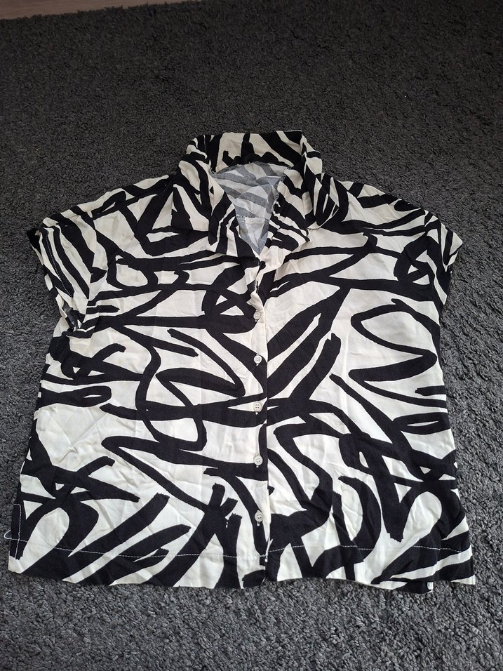 Düğmeli, kısa kollu, yakalı kadın gömleği zebra desenli, bol kesim,tüm boy 55cm,koltuk altından koltuk altına 58cm,tertemizdir