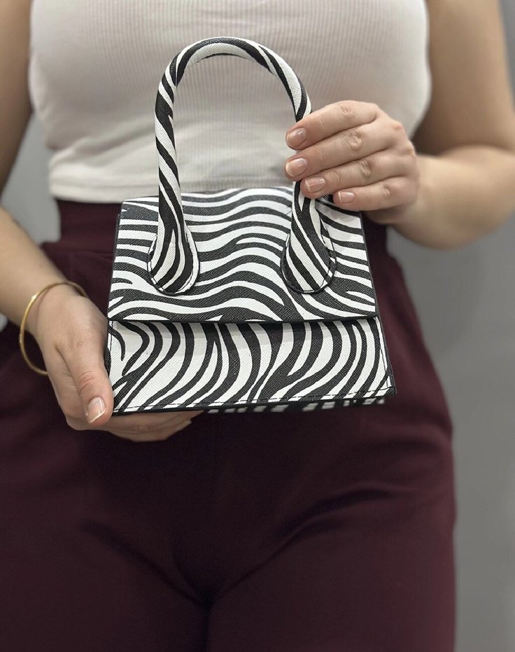 Sentetik kumaştan yapılmış, beyaz ve gri zebra desenli, fermuarlı modern kadın günlük çantasıdır.