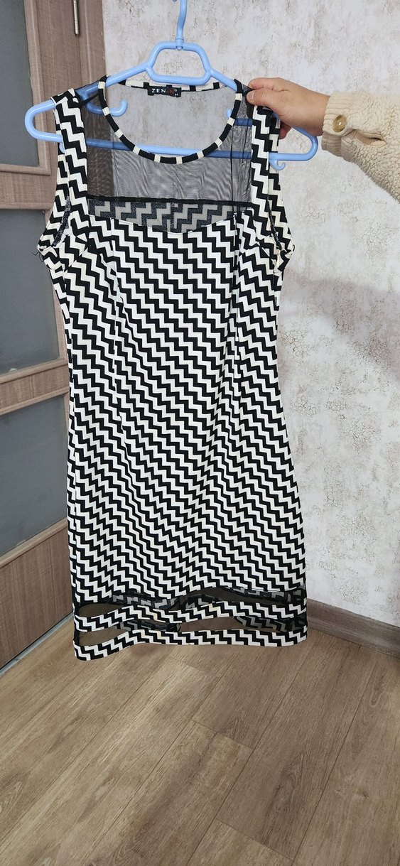 Bu kadın kalem elbise, siyah beyaz zebra desenli, pile detaylı ve tekne yaka ile tasarlanmıştır. Askılı kollu ve uzun boyludur, yumuşak sentetik kumaştan yapılmıştır, günlük kullanım için modern bir tarza sahiptir. 1 kere giyilmistir