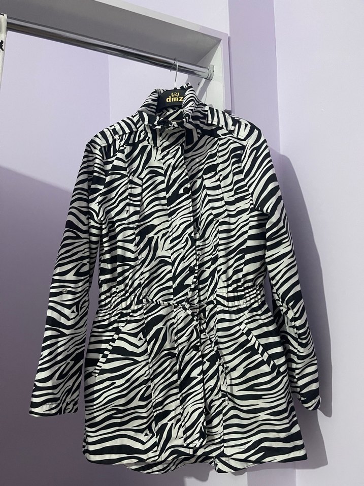 Zebra desenli, yakalı ve uzun kollu kadın ceket. Midi boyda ve vücuda oturan kesimde, yumuşak sentetik kumaştan üretilmiştir. Günlük sokak stili için uygundur. Bir saatlik tek giyilmistir. Yepyeni gibi. Degirmesi yoktur.
