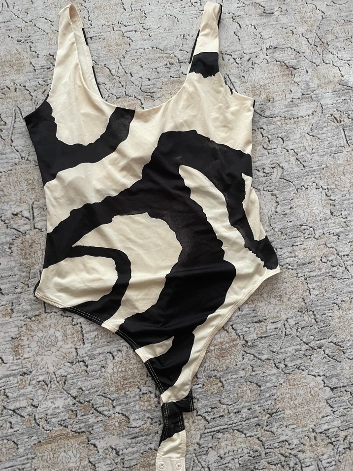 Siyah ve gri zebra desenli, strappy kollu, kürk detaylı, modern ve avant-garde tarzda, günlük kullanıma uygun kadın monokini.