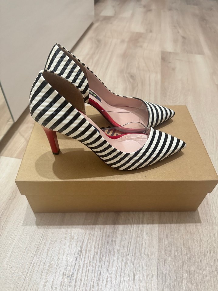 Kadın stiletto topuklu ayakkabılar, pilili zebra deseni ve koyu beyaz kauçuk malzeme ile çağdaş ofis stiline uygun. Derinet marka