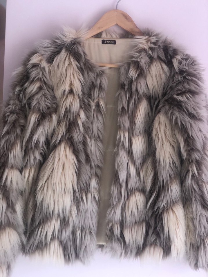 Gri zebra desenli, suni kürkten yapılmış, uzun kollu ve normal boyda, bohem tarzı kız çocuk ceketi. Rahat ve şık bir günlük kullanıma uygundur.