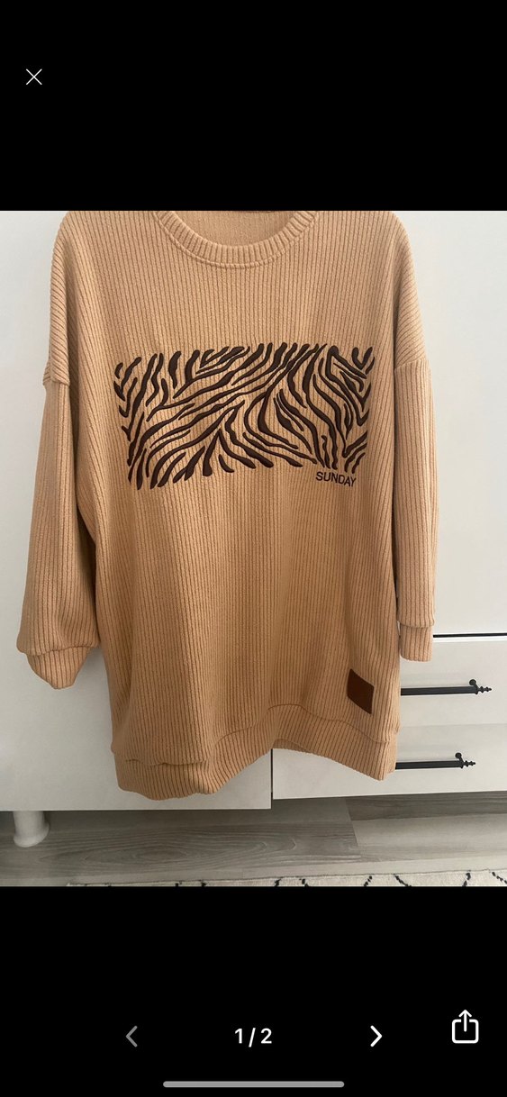 Açık kahverengi, zebra desenli, uzun kollu, yuvarlak yakalı, bol kesim kadın triko kazak. Rahat ve yumuşak dokusu ile günlük sokak tarzına uygun.
