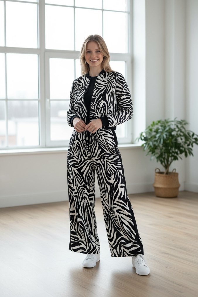 S M L Xl bedenler mevcuttur Kadınlar için siyah ve gri zebra desenli, uzun ceketli, regular fit takım. Uzun kollu, kırmalı yakalı ve pileli pantolonlu, sentetik kumaştan yapılmıştır.