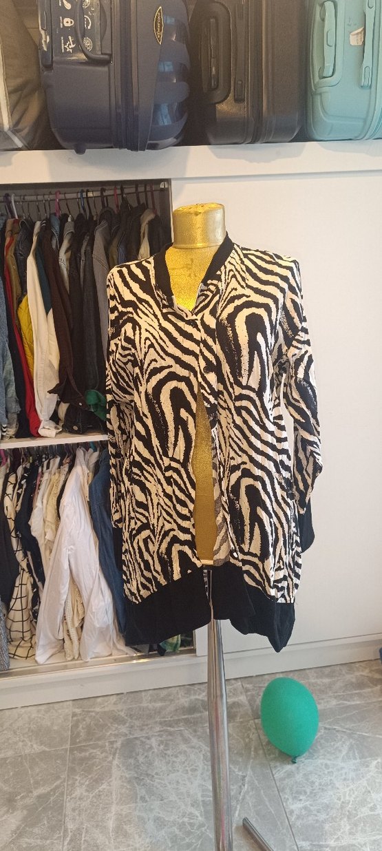 Kadınlar için zebra desenli, uzun kollu ve uzun kesim bol oturan ceket. V yaka ve fermuarlı ön kısmı sentetik kumaştan yapılmıştır. Avant-garde sokak stili, günlük kullanım için uygundur.