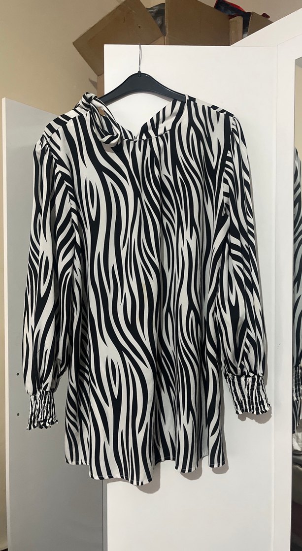 Zebra desenli, uzun kollu, yüksek yakalı kadın bluzu. Pilili detaylar, bol kesim ve midi boyda. Sentetik kumaştan, çağdaş ve trend görünümlü, gri ve beyaz renklerde.