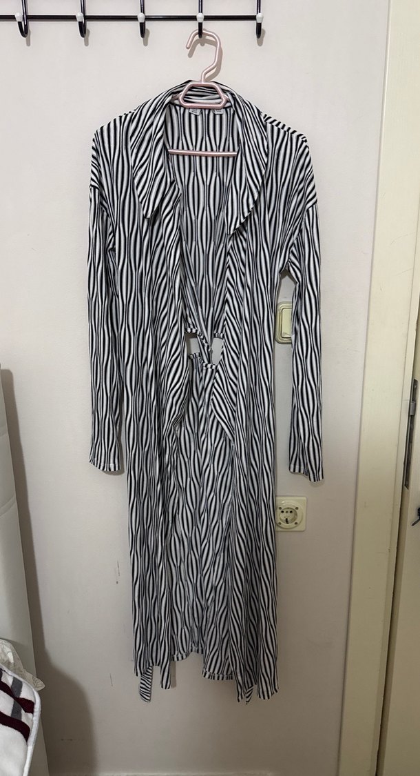 Kadınlar için uzun kollu, regular fit kesim uzun boy elbise. Beyaz zemin üzerine koyu zebra desenli, Paris sokak modasından ilham alınmış.