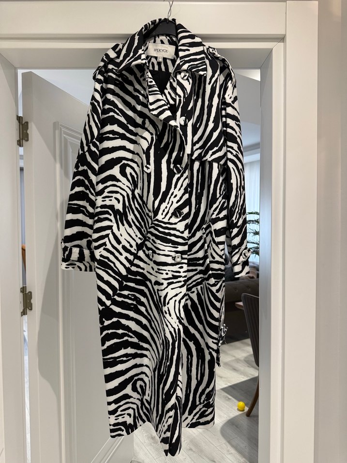 Bu uzun kadın trench coat, zebra desenli ve kürk detaylıdır. Sentetik kumaştan, bol kesim, uzun kollu ve yaka detaylıdır.
