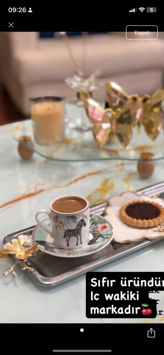 Zebra desenli kahve fincanı ve tabağı, yanında kurabiye ile birlikte şık bir tepside sunuluyor. Sıfır üründür. ☕
