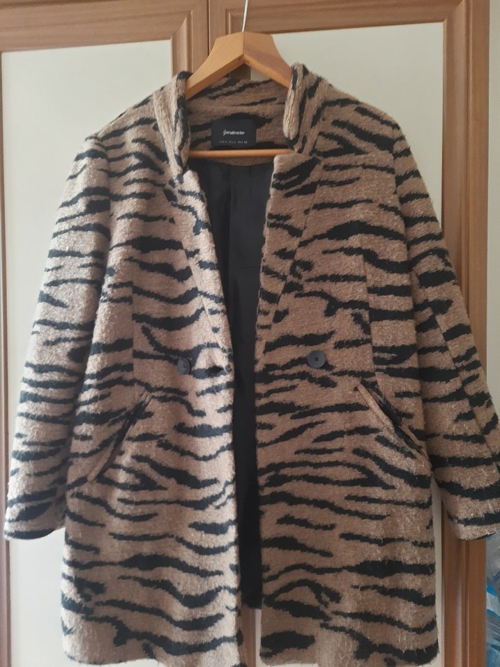 Zebra desenli, kürk detaylı, bol kesim ve uzun kollu kadın midi kaban. Rahat ve sıcak peluş kumaştan, günlük sokak stili için uygun.