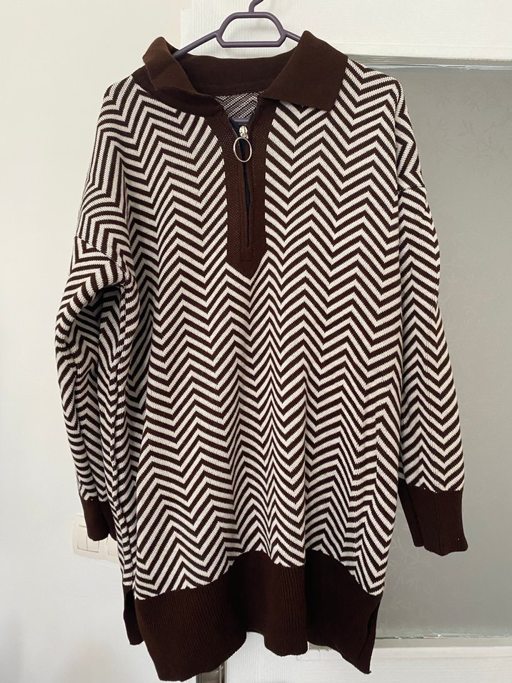 Zebra Desenli Kahverengi Yarım Fermuarlı Triko
