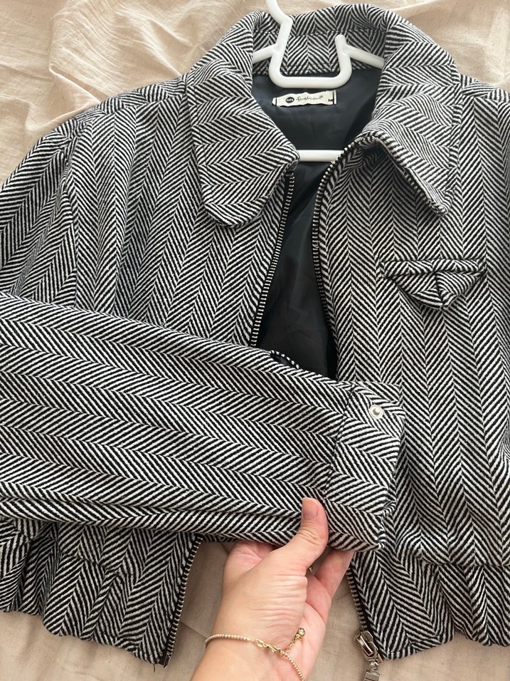 Kadınlar için kısa, gri zebra desenli ceket. Notlu yakalı ve fermuarlı, sentetik kumaştan üretilmiş, uzun kollu ve günlük kullanıma uygun.Havostan almıştım iki kere falan giydim kolları bana kısa geldi o yüzden pek giyinmedim