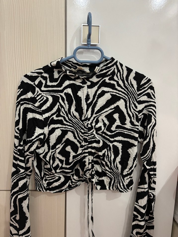 Uzun kollu, yüksek yakalı ve kısa kesim kadın bluz. zebra desenli ipli