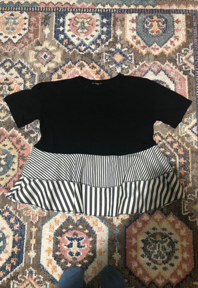 Kısa kollu, yuvarlak yaka ve bol kesim bluzu. Siyah üst kısmı ve zebra desenli fırfırlı kısa etek ucu ile günlük kullanıma uygun, şık sokak stili.