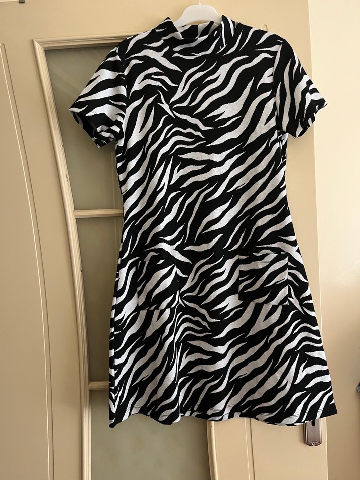 Siyah beyaz zebra desenli midi elbise, kısa kollu, yüksek yakalı ve pileli tasarıma sahip. , dar kesimli, şık ve sokak modasına uygun.