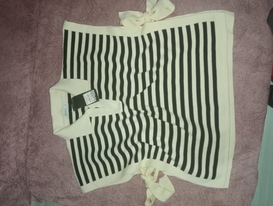 Kadın süveter, kısa kollu ve halter yakalıdır. Örme zebra desenli, midi boyda ve bol kesimdir. Günlük rahat sokak stili için uygundur.