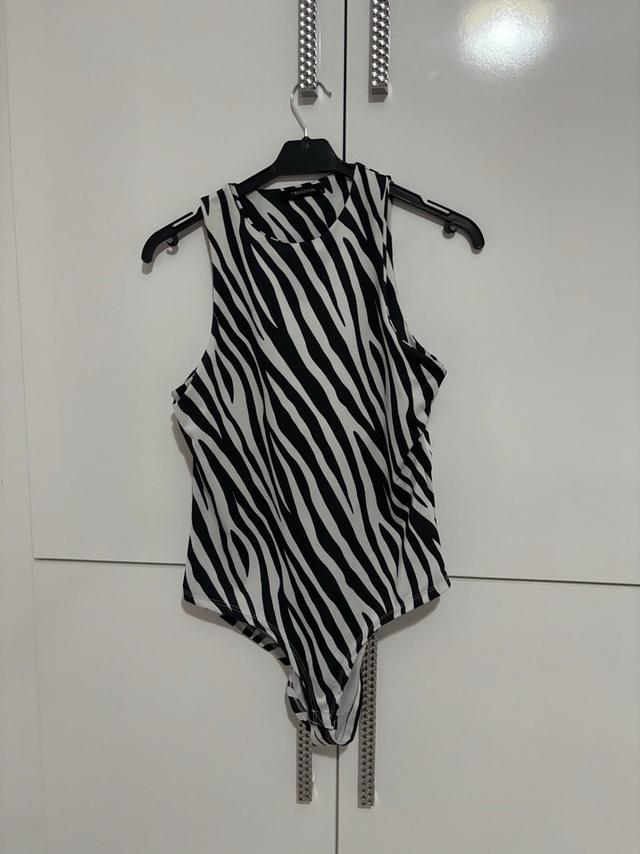 Kolsuz, yüksek yakalı, zebra desenli ve sıkı oturan body. Yumuşak sentetik kumaştan, gri renkte, sokak modasına uygun. Sayılı giyildi