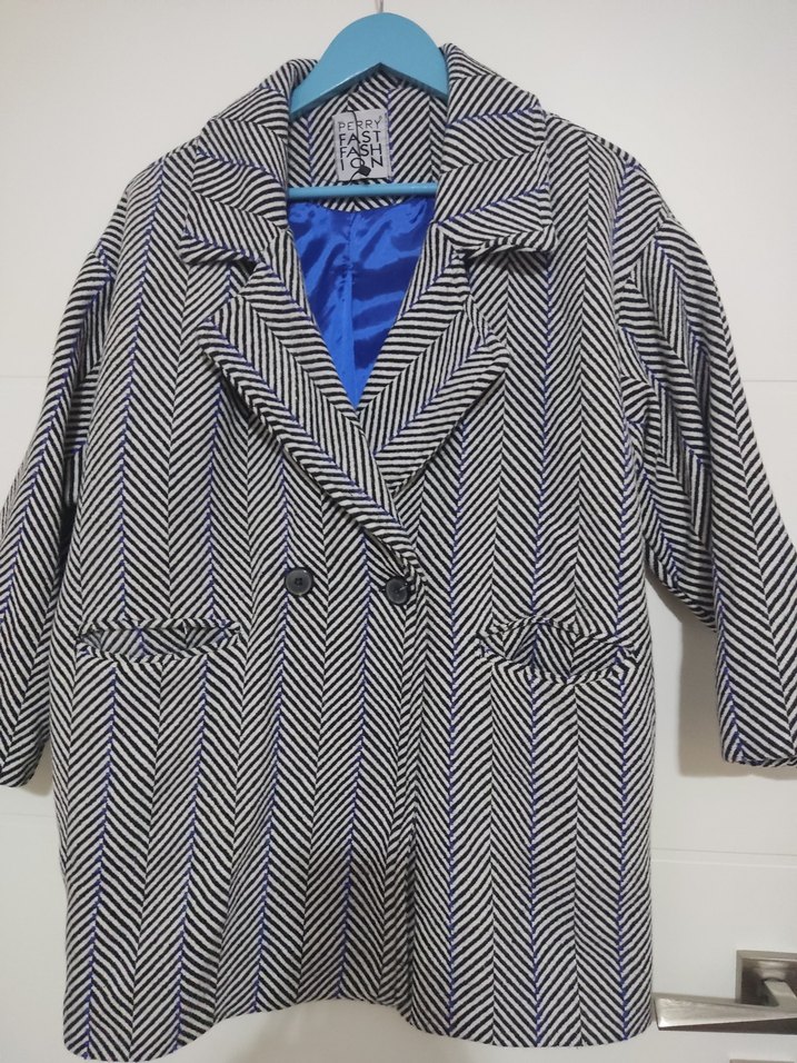 Kadın ceketi, yaka detaylı ve düğmeli ön kısmıyla uzun kolludur. Sentetik kumaştan üretilmiş, gri ve mavi tonlarda zebra desenlidir. Normal uzunlukta ve regular fit kesime sahiptir. Ofis ve sokak stili için uygundur. large xlarge uyumludur...boy75..en57
