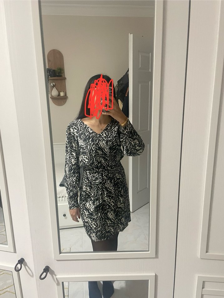 V yaka ve uzun kollu, zebra desenli bol kesim midi elbise. Kemerli ve sentetik kumaştan, günlük sokak stili için uygun. Birkaç kez giyildi.Fotoğrafta 54kgyum.50kg iken de giymiştim rahat bir model sezonluk.Yeni gibi hiçbir sorunu yok kemerlidir