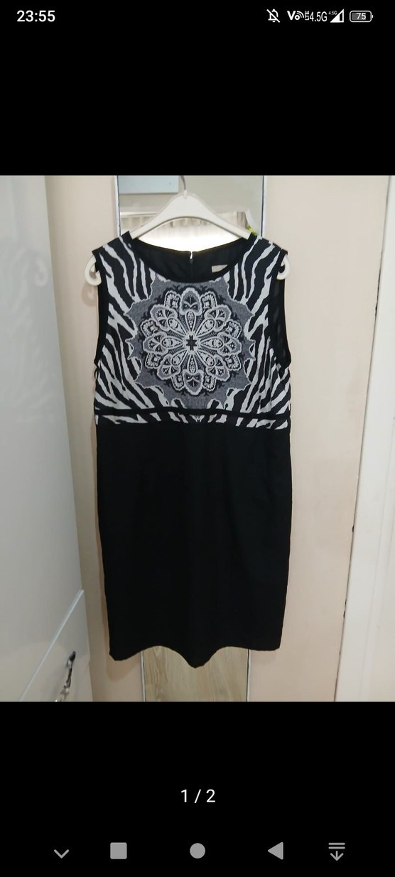 Üst kısmı zebra desenli, i ve askısız yakalı, siyah midi boy, bol kesim kadın elbisesi. Gotik ve bohem tarzda, günlük kullanıma uygun.