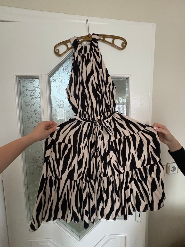 Yüksek yakalı, askılı ve pilili zebra desenli, bol kesim midi elbise, yumuşak sentetik kumaştan üretilmiştir.