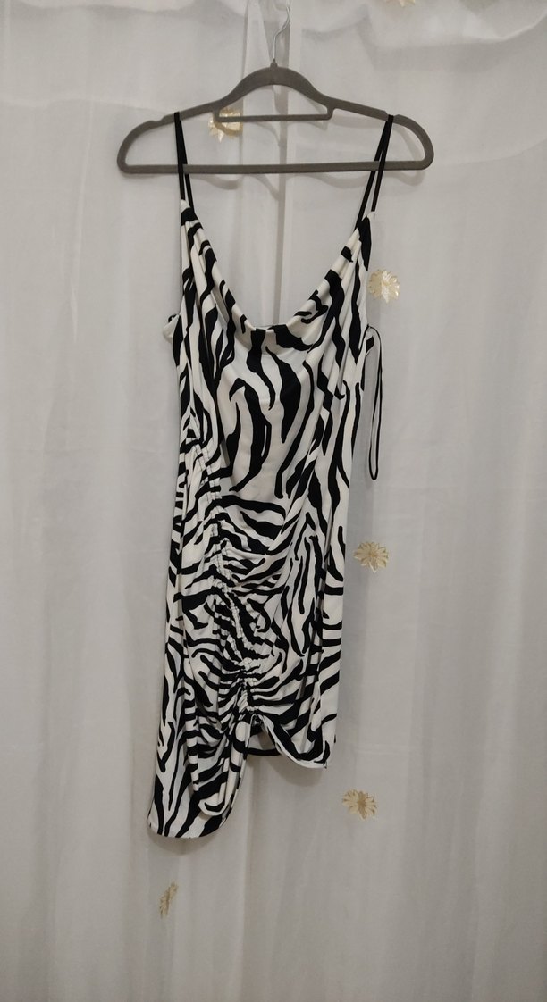 Zebra desenli, askılı ve drapeli kısa mini elbise. Sentetik kumaştan, sokak modası ve avangard tarzlar için uygun.