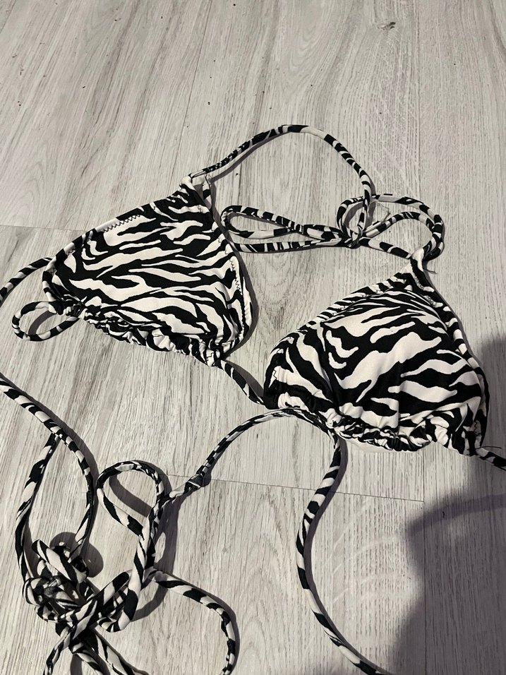 Zebra desenli, zincir detaylı ve askılı mini bikini. Sokak modasına uygun, avant-garde tarzda, dış mekan kullanımı için ideal.