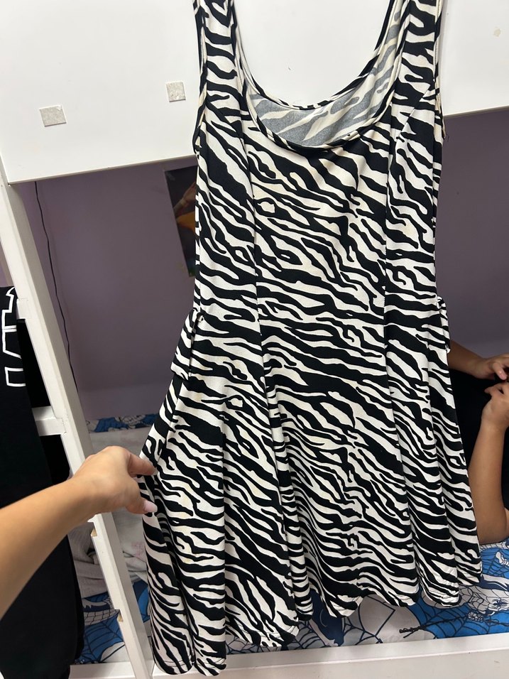 Zebra desenli, straplez yaka ve fırfırlı detaylara sahip mini boy dar kesim elbise, yıkanınca geçicek sarı lekeleri var ona göre fiyat yazacağım