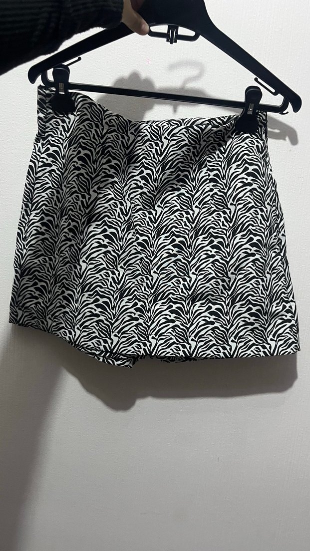 Gri ve beyaz zebra desenli, pilili ve vücuda oturan mini etek. Sentetik kumaştan yapılmış, sokak stili ve dış mekan kullanımı için uygundur.