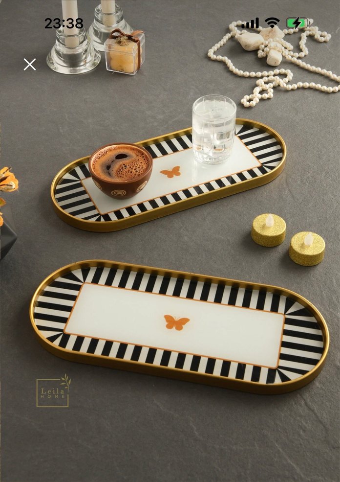 Zebra desenli, koyu kenarlı ve ortasında kelebek motifi bulunan iki oval tabak. Modern klasik tarzda tasarlanmıştır.