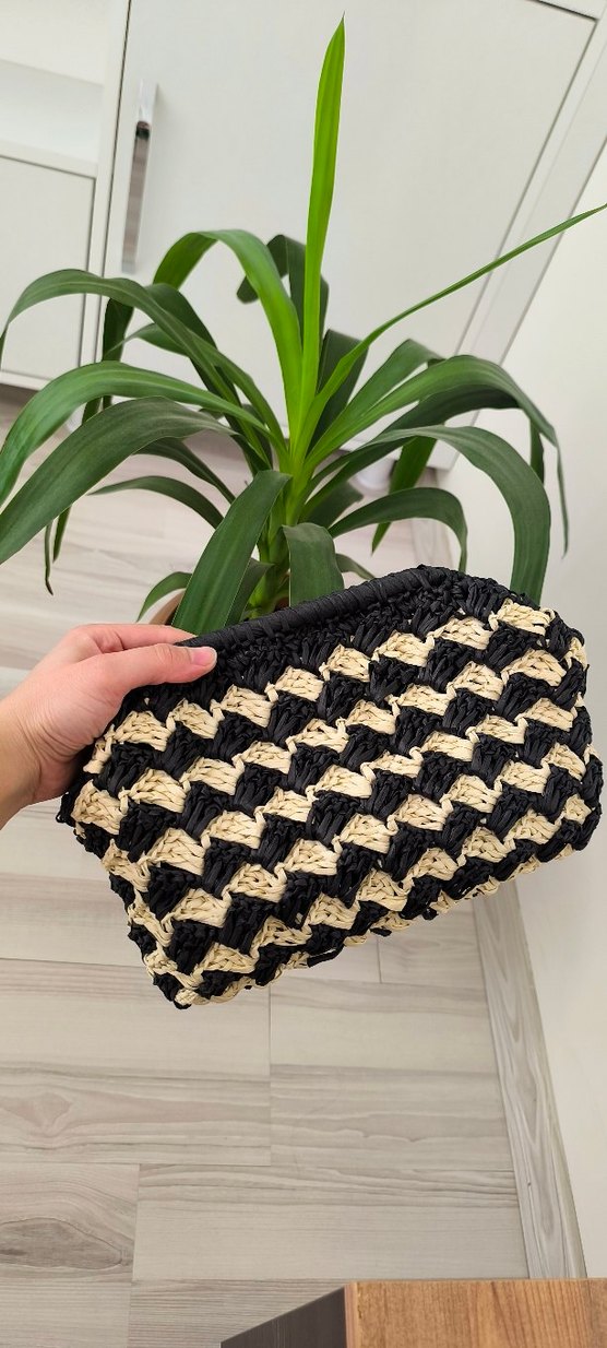 Siyah ve krem örgü zebra desenli, yumuşak örgü kumaştan kadın portföy çanta. Bohem tarzıyla günlük kullanıma uygun.