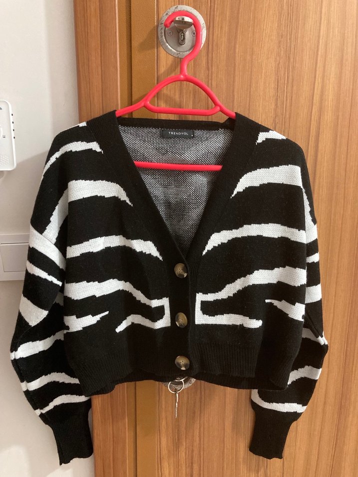 Siyah örgü hırka, zebra desenli, uzun kollu crop model hırka