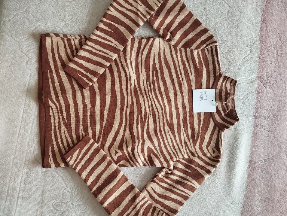 Bu kadın bluz, kahverengi ve gri tonlarda zebra desenlidir. Uzun kollu, tekne yaka ve örme yumuşak kumaştan yapılmıştır. Rahat ve şık bohem tarz sunar.