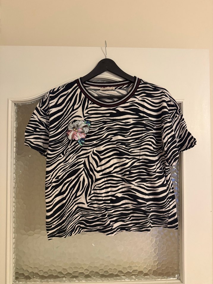 Bol kesim, kısa kollu ve yuvarlak yakalı tişört. Koyu gri zebra desenli ve payet işlemeli çiçek detayı bulunur. Bohem tarzına uygun. L beden