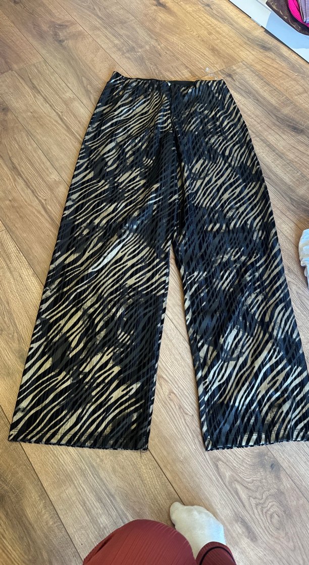 Kadınlar için uzun, bol kesim, zebra desenli ve pilili pantolon. Sentetik kumaştan, sokak stili ve açık hava kullanımı için uygundur.