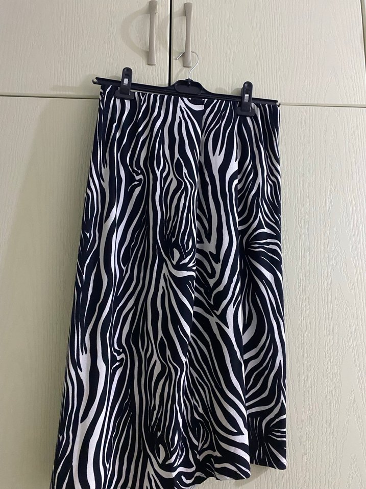 Kadınlar için zebra desenli, pilili ve bol kesim midi etek. Sentetik kumaştan üretilmiş, günlük kullanıma uygun koyu renkli sokak tarzı bir parça.