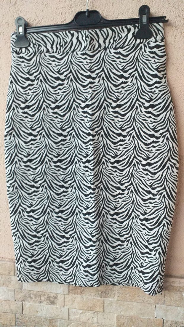 Siyah ve gri zebra desenli, pilili ve normal boy midi hamile eteği. Sentetik kumaştan, şık ve günlük kullanıma uygun.