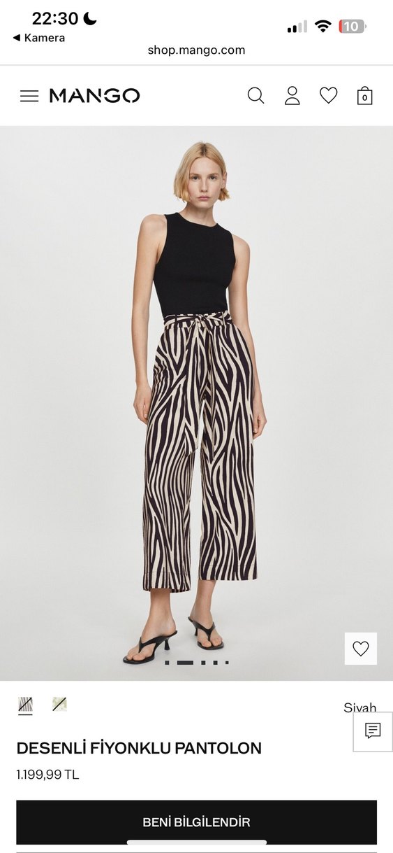 Zebra desenli pilili, sentetik kumaştan yapılmış, midi boy, bol kesim kadın pantolon, günlük kullanıma uygun.
