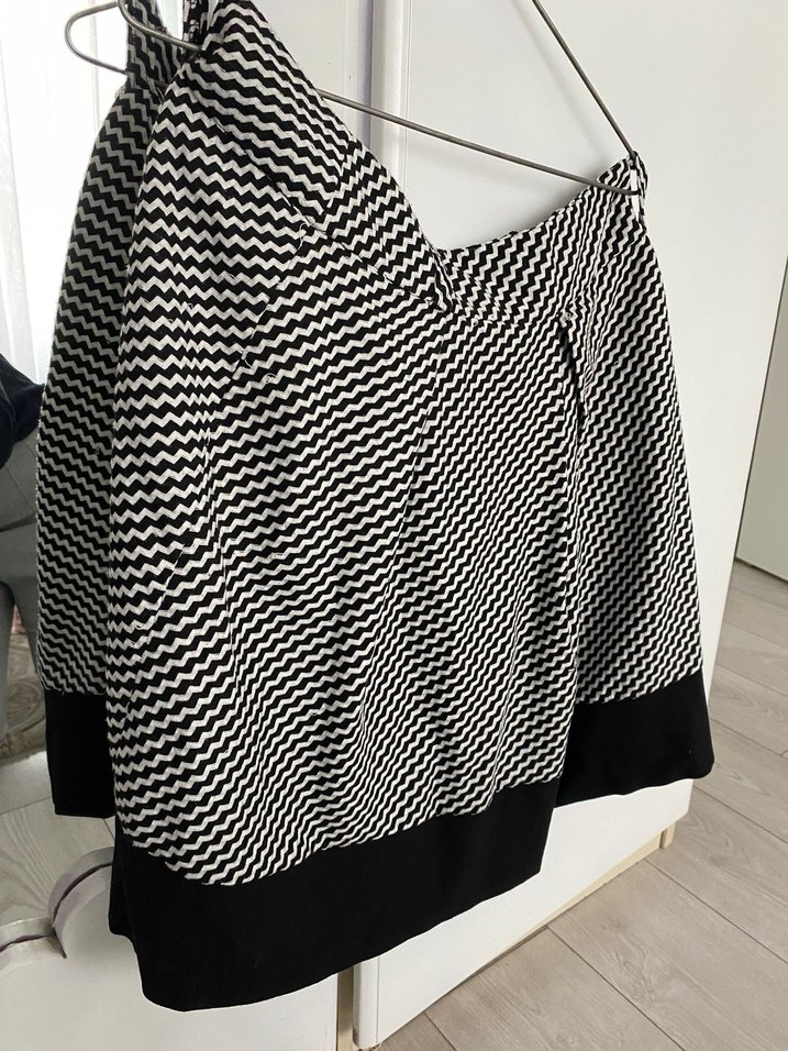 Siyah renkli, sentetik kumaştan yapılmış, pilili ve zebra desenli, bol kesim mini etek.