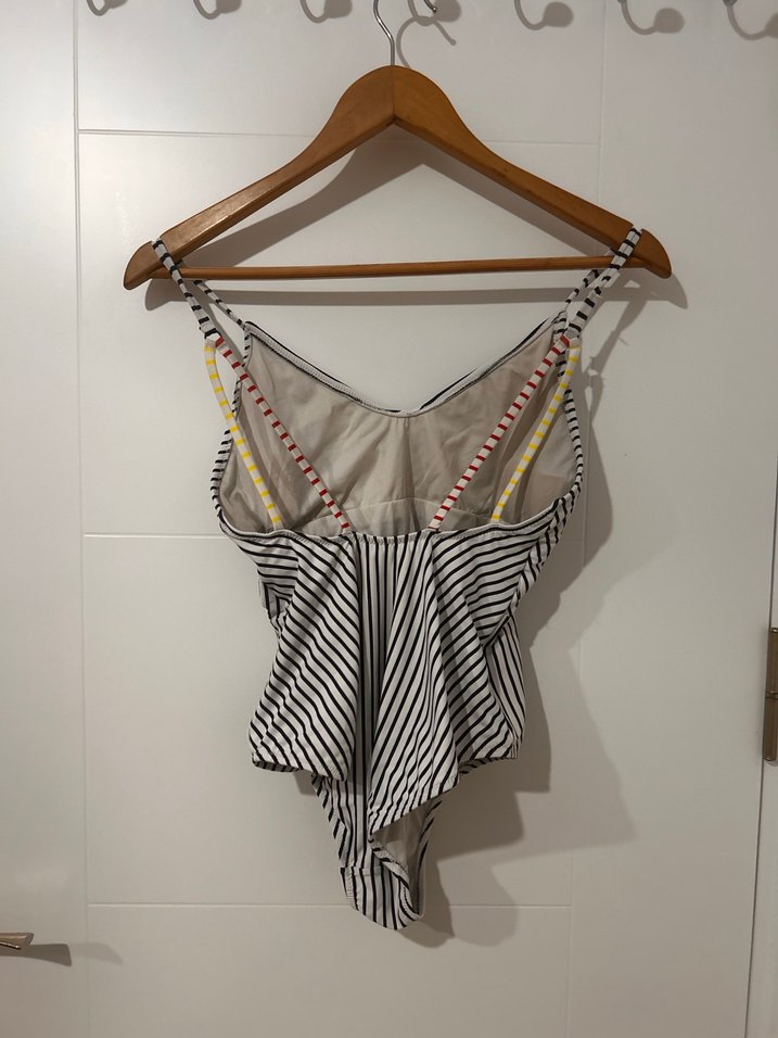 Bohem tarzda, zebra desenli ve pliseli, askılı, vücuda oturan mayo. Plaj için uygun.