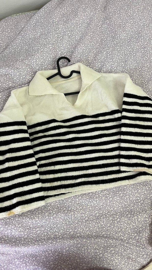 Uzun kollu ve kayık yaka, zebra desenli beyaz-gri örme kadın kazak, rahat kesim ve günlük sokak stiline uygun.
