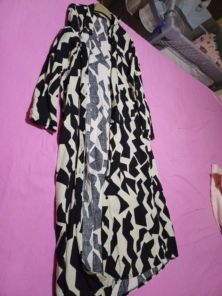 Uzun, salaş kesim hamile ceketi, yakalı ve uzun kolludur. Siyah-beyaz zebra desenli, avant-garde sokak stili sunar. Günlük kullanıma uygundur.