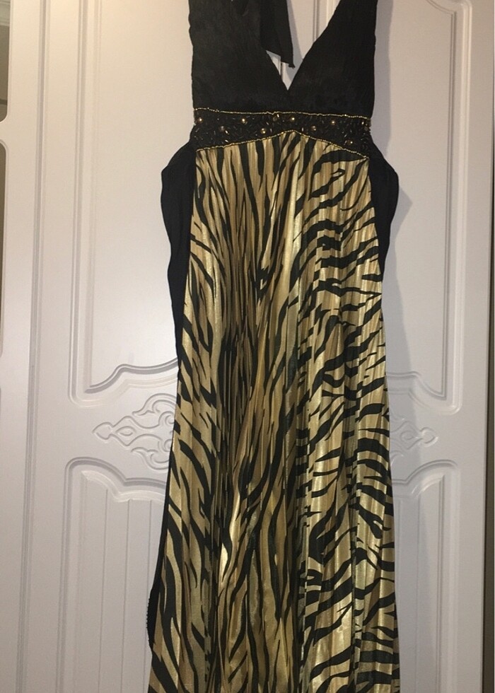 Boyundan bağlamalı zebra desenli saten abiye sadece 1 kez giyilmiştir. 36-38 bedene uygundur