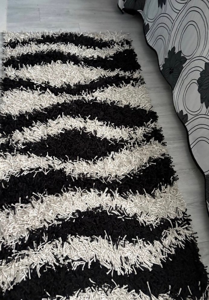 halı, siyah ve beyaz tonlarda zebra desenine sahiptir, herhangi bir odaya modern bir dokunuş katar. 80’150 yolluk