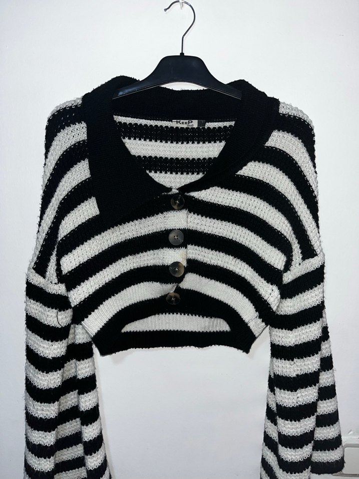 Siyah beyaz zebra desenli, uzun kollu, yakalı örgü kısa kazak. Rahat ve bol kesim, gündelik rahat kullanım için uygundur.