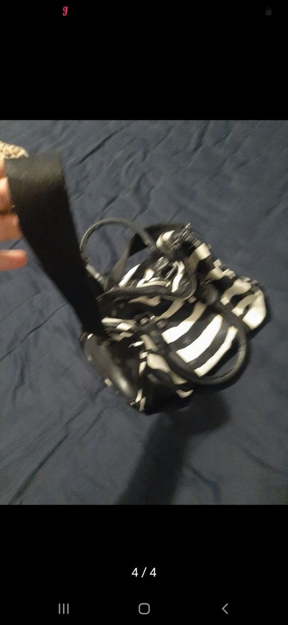 Siyah deri, zebra desenli ve tokalı kadın çanta. Gotik ve avangart tarzı bir araya getiriyor. Moda öncüsü için uygun.