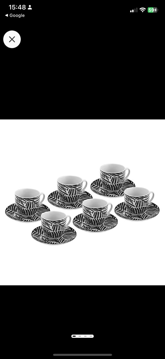Zebra desenli siyah fincan ve tabak seti, kahve veya çay servisi için uygundur.