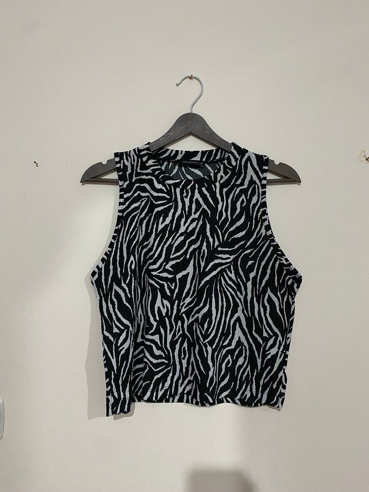 Yüksek yakalı, pileli sentetik kumaştan, zebra desenli siyah gri, kısa ve dar kesim kolsuz crop top. Outdoor kullanıma uygun.